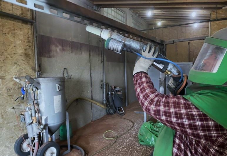 Sand blasting, or more generally media blasting, is a process that uses high-pressure air to propel abrasive particles against a surface to clean, smooth, or roughen it. This process is commonly used to remove rust, old paint, scale, or debris from metal surfaces before powder coating
